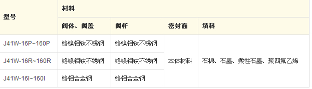 J41W型PN16~PN160不銹鋼截止閥:手動(dòng)、法蘭連接、直通式、閥座密封面材料為 0Cr18Ni9 系不銹鋼(J41W-16P~160P)、0Cr17Ni12Mo2 系不銹鋼(J41W-16R~160R)、1Cr5Mo 鉻鉬鋼(J41W-16I~160I),公稱壓力 PN16~PN160,閥體材料為 0Cr18Ni9 系不銹鋼(J41W-16P~160P)、0Cr17Ni12Mo2 系不銹鋼(J41W-16R~160R)、1Cr5Mo 鉻鉬鋼(J41W-16I~160I)的截止閥。